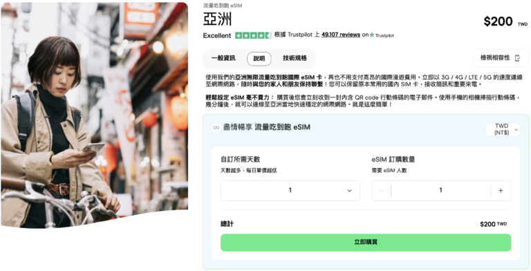 - 價格範圍:5 天 3GB 流量 TWD 340 台幣、吃到飽 1 天 TWD 180 台幣起