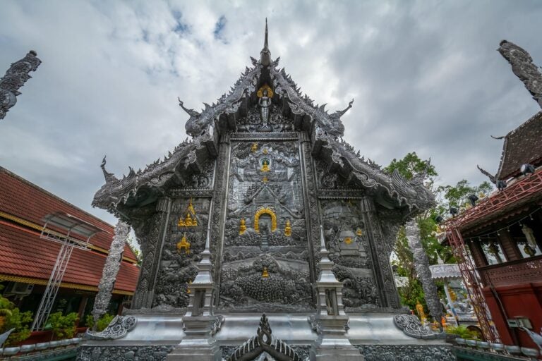 素攀寺位於清邁週六夜市路上,雖然佔地不大,但處處可見精湛的工藝技術。寺廟內的銀質浮雕細緻描繪著佛教故事和泰國文化元素。寺廟旁的銀色象神像象徵著財富,祭壇下方還有金銀雙色的老鼠捧著財寶,雕工精美可愛。