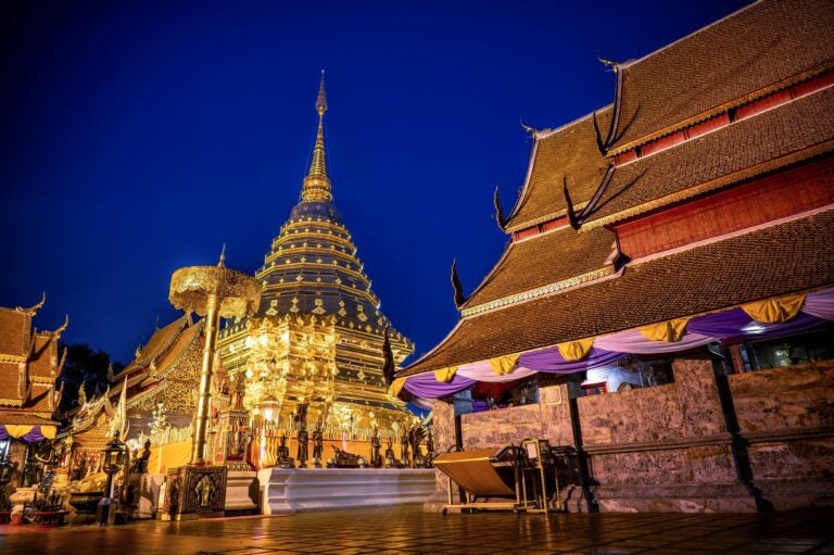 位於素帖山海拔 1,055 公尺處的雙龍寺是一座備受尊敬的佛教寺廟,從這裡可以俯瞰整個清邁市區和周邊鄉村的景色,建議天氣好時前往,能有最棒的視野。傳說一頭白象背負著佛陀舍利爬上素帖山,在現址吼叫三聲後離世,因此被視為建寺的神聖之地。寺內供奉著佛陀舍利,是泰國佛教徒重要的朝聖地點。