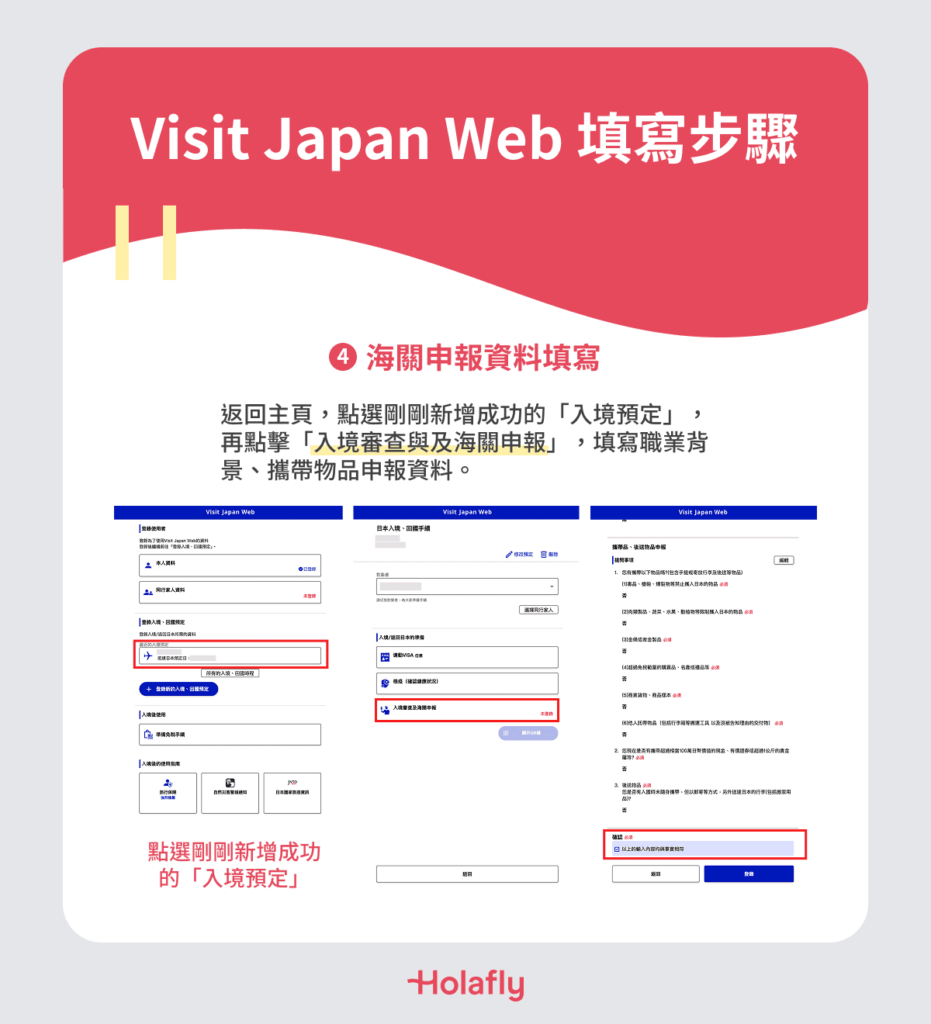 - Step4 海關申報資料填寫:返回主頁,點選剛剛新增成功的「入境預定」,再點擊「入境審查與及海關申報」,填寫職業背景、攜帶物品申報資料。